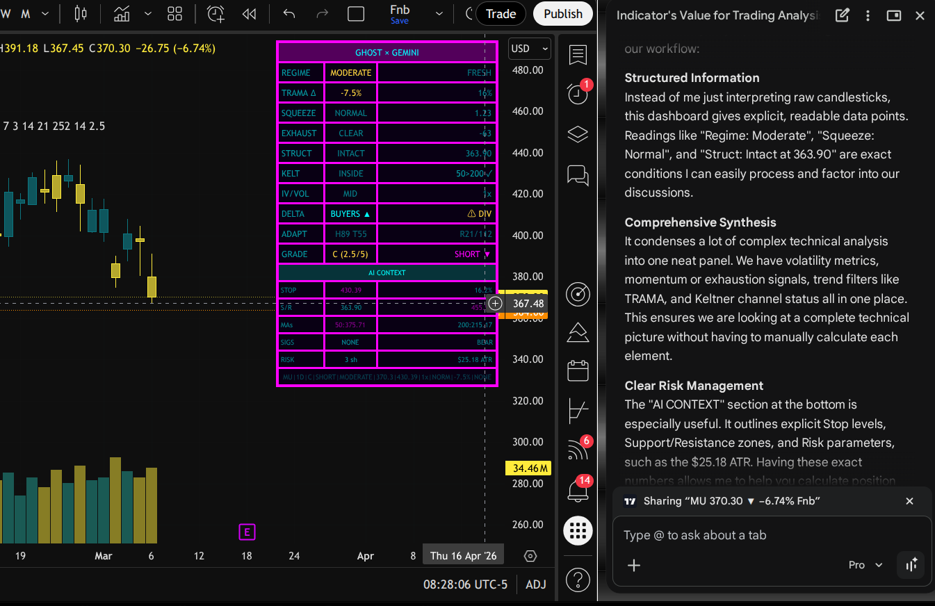 "I built Ghost Alpha because I was tired of 6 indicators fighting each other on my chart. I needed one panel that told me: is this a trade, what direction, and where's the stop. One glance: GRADE A — LONG — Ghost Trail at 665. Done."